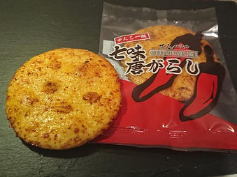 しょうゆ味のせんべいに七味唐辛子をかけた一品。